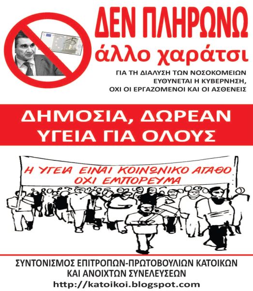 εξεταστούν στα δημόσια νοσοκομεία και στα Κέντρα Υγείας Σε λίγο θα μας πουν ότι για να «σωθούν» τα Ασφαλιστικά Ταμεία πρέπει να κοπούν όλες οι κοινωνικές παροχές, τα επιδόματα, οι εξετάσεις, τα φάρμακα, τα νοσήλεια, να κατεδαφιστεί πλήρως ότι έχει μείνει ακόμα όρθιο από το Κοινωνικό Κράτος στη χώρα μας. Εκεί οδηγεί η λογική της αντιμετώπισης της δημόσιας περίθαλψης ως «περιττό βάρος» για το Κράτος, που πρέπει σταδιακά να μεταφερθεί στις πλάτες των πολιτών. Δεν θέλουν να αντιμετωπίσουν τα σοβαρά και χρόνια προβλήματα του ΕΣΥ που σχετίζονται κυρίως με τις ελλείψεις προσωπικού, υποδομών και πόρων. Θέλουν φτηνή και κακής ποιότητας περίθαλψη. Όποιος θέλει καλύτερες υπηρεσίες ας πληρώσει από την τσέπη του! Άλλωστε στη χώρα μας έχουμε ήδη τις πιο ψηλές ιδιωτικές δαπάνες υγείας στην Ευρώπη. Το αν αντέχουν οι πολίτες σε περίοδο κρίσης να επιβαρύνονται ακόμα περισσότερο για την υγεία τους , δεν τους απασχολεί. Το μοναδικό μέλημα τους είναι να τηρηθούν απαρέγκλιτα οι επαχθείς για την εργασία , τα δικαιώματα και το δημόσιο συμφέρον όροι του Μνημονίου.
